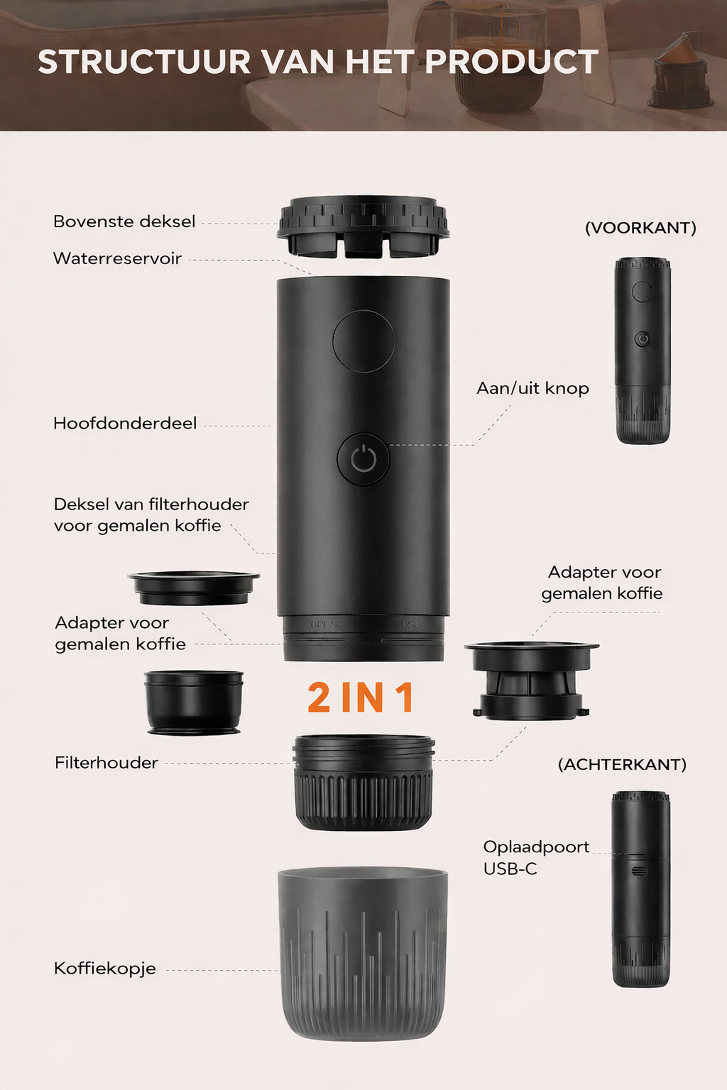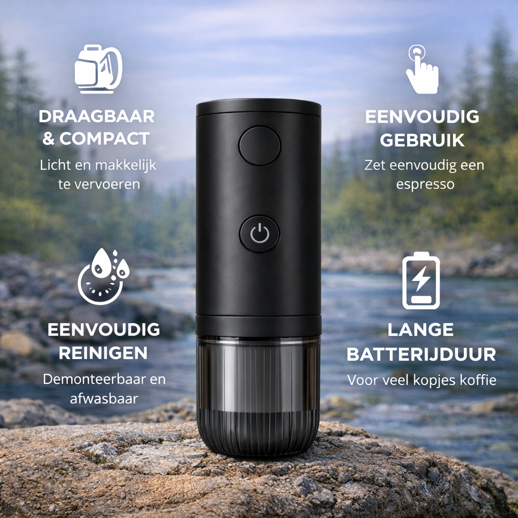 De meeste draagbare koffiemachines werken alleen met warm water, waardoor u een thermosfles of waterkoker moet meenemen. Met onze machine vergeet u deze beperkingen.